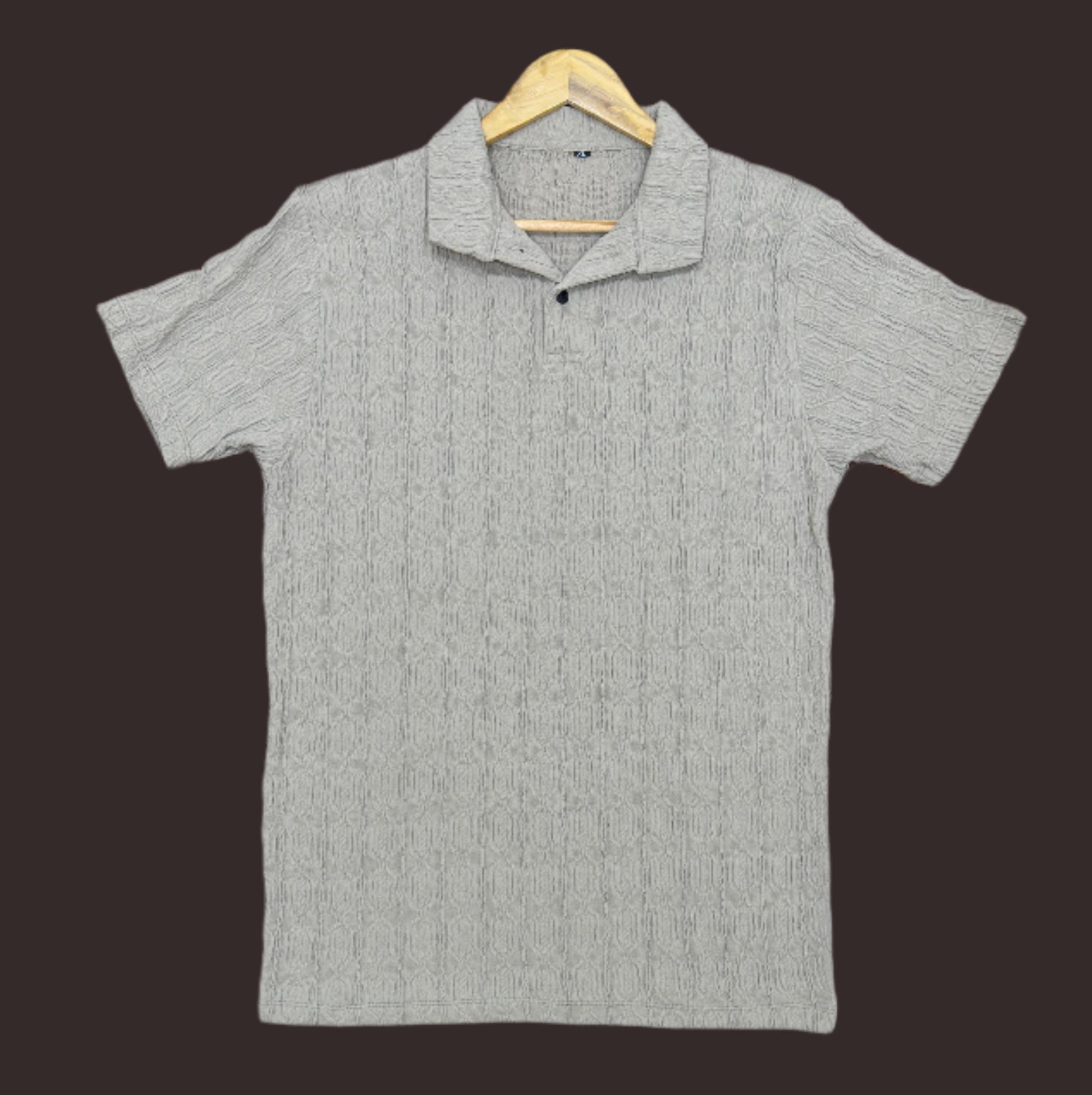 Add texture and comfort to your wardrobe with this men's popcorn knit polo shirt. Featuring a soft, crinkle-textured fabric and a relaxed fit, it’s perfect for casual wear. The off-white color and subtle pattern add a stylish touch to any outfit.